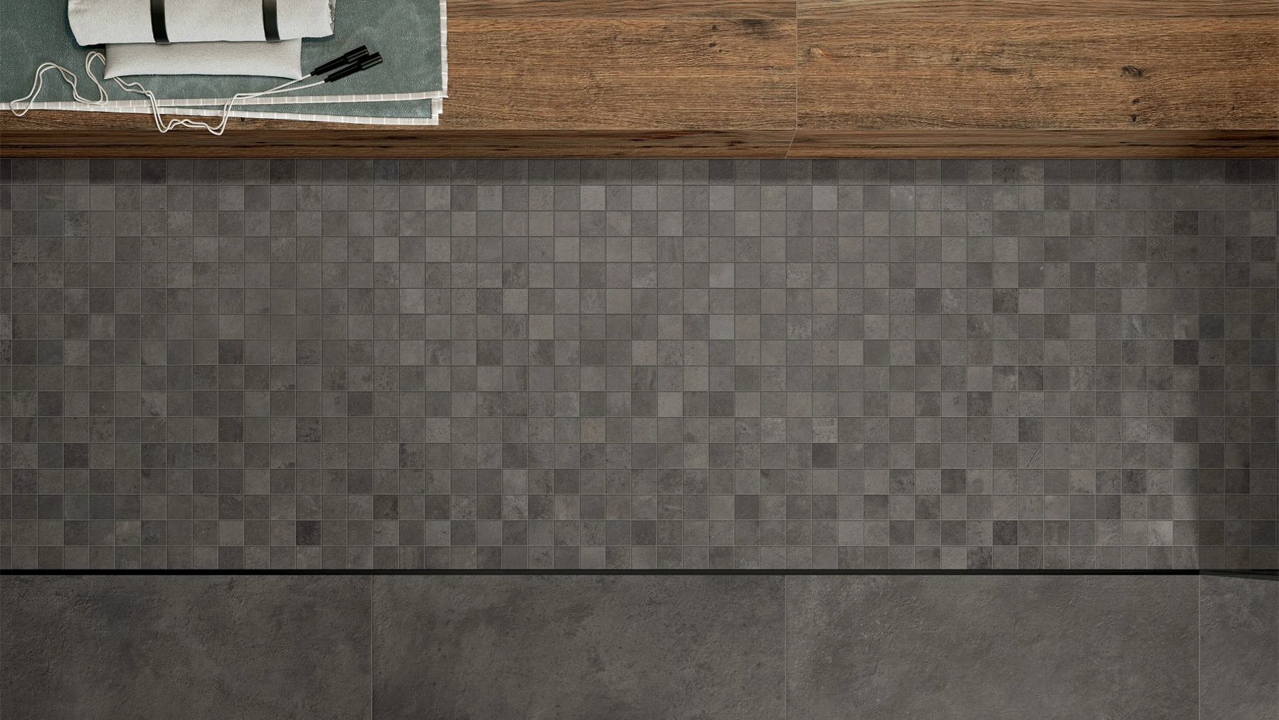 Design to the fore in the relaxation area, where the dark, confident tones of the cement effect meet deep blue, creating a unique mix.